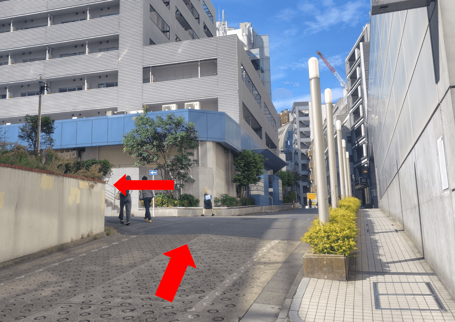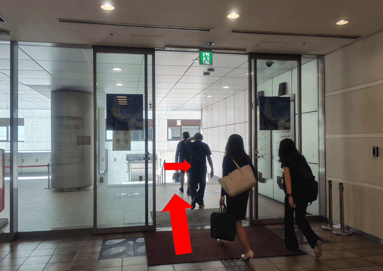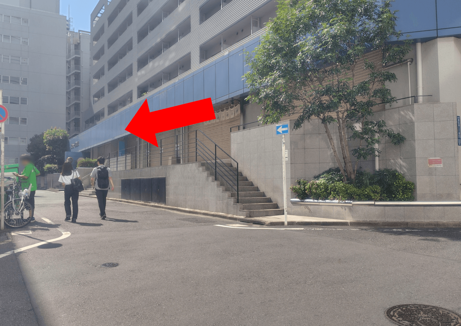 自動ドアから外へ出て、階段を下りたら右に曲がります。