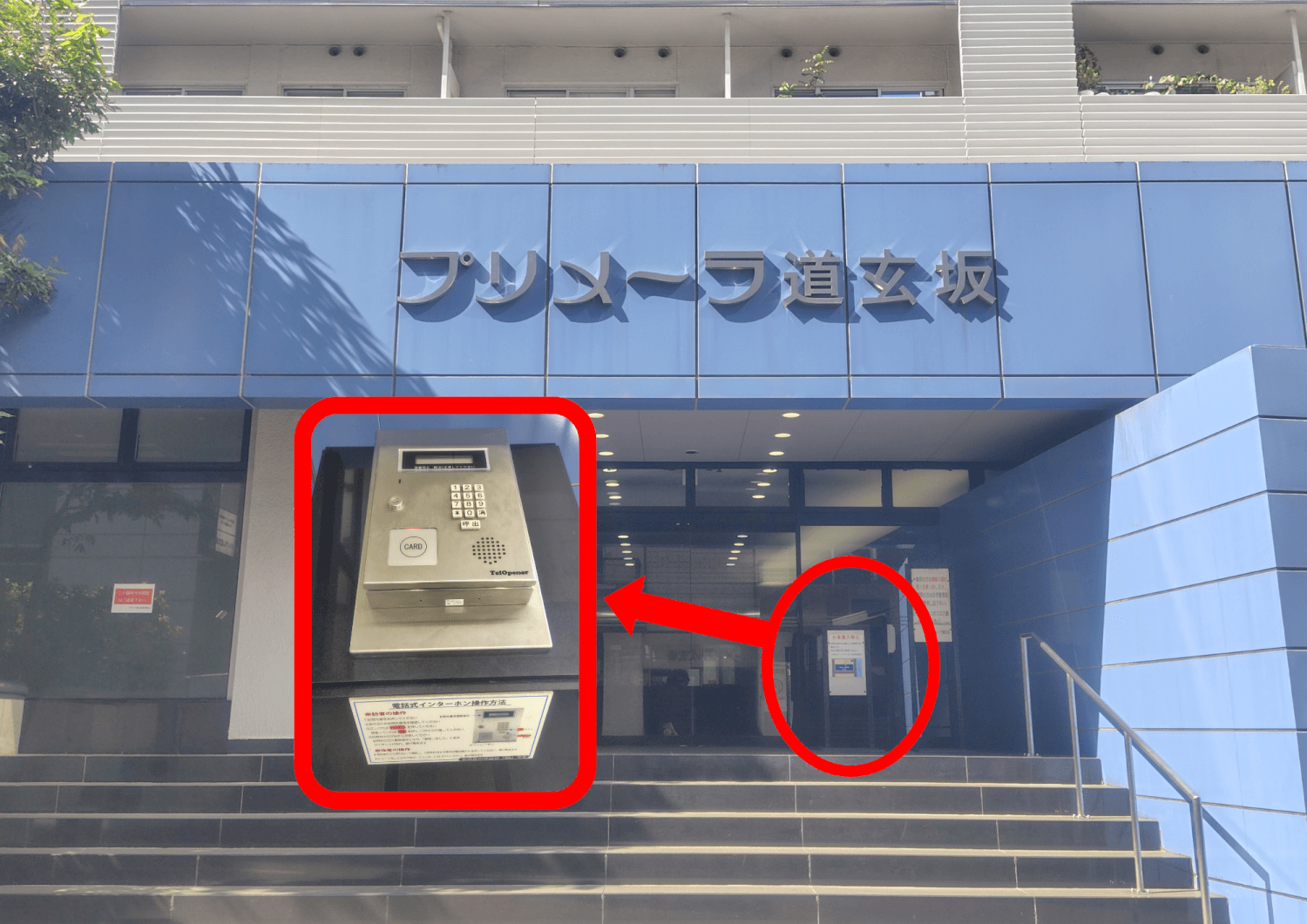 自動ドアの手前にあるインターホンで、「225」「呼出」を押してください。