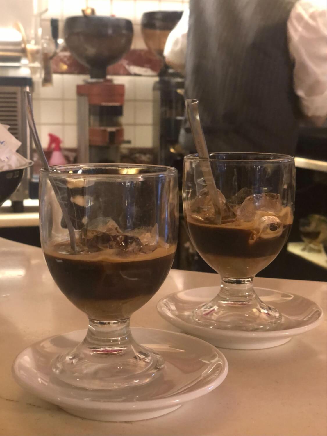 氷とアーモンドミルク(シロップ)が入ったグラスに熱々のエスプレッソを入れる、飲み物です。あま~いシロップとエスプレッソがなんとも言えない絶妙な相性で、一度飲んだら病みつきに…。