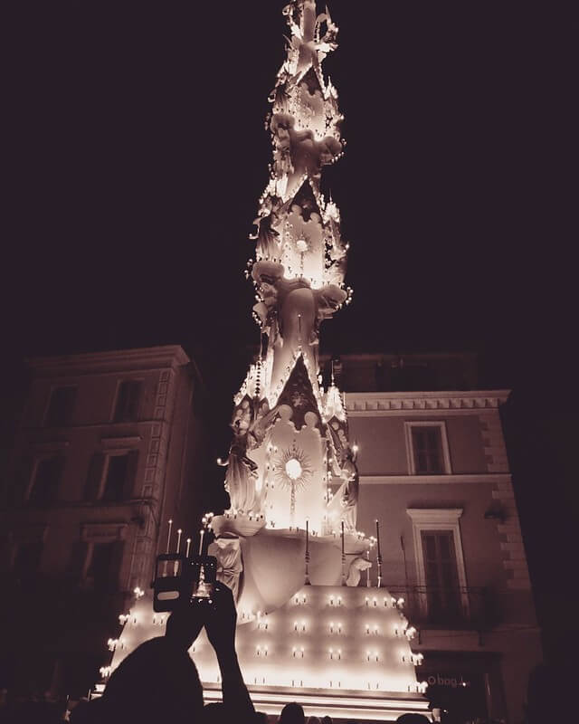 美しく装飾の施されたこの巨大な「マッキナ」は祭りの当日になると幻想的にライトアップされます。そして、山車に据えられ100人もの男性に担がれて、街の路地を進んで行くのです!