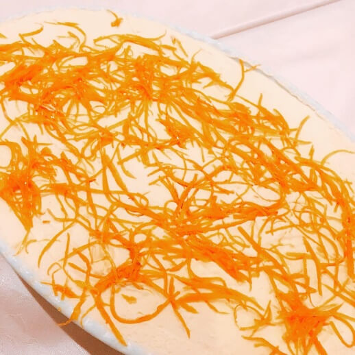 オレンジピールは皮からシェフが作ったもので、しぼり汁はスポンジ生地にたっぷりしみ込んで、果汁感たっぷりです!