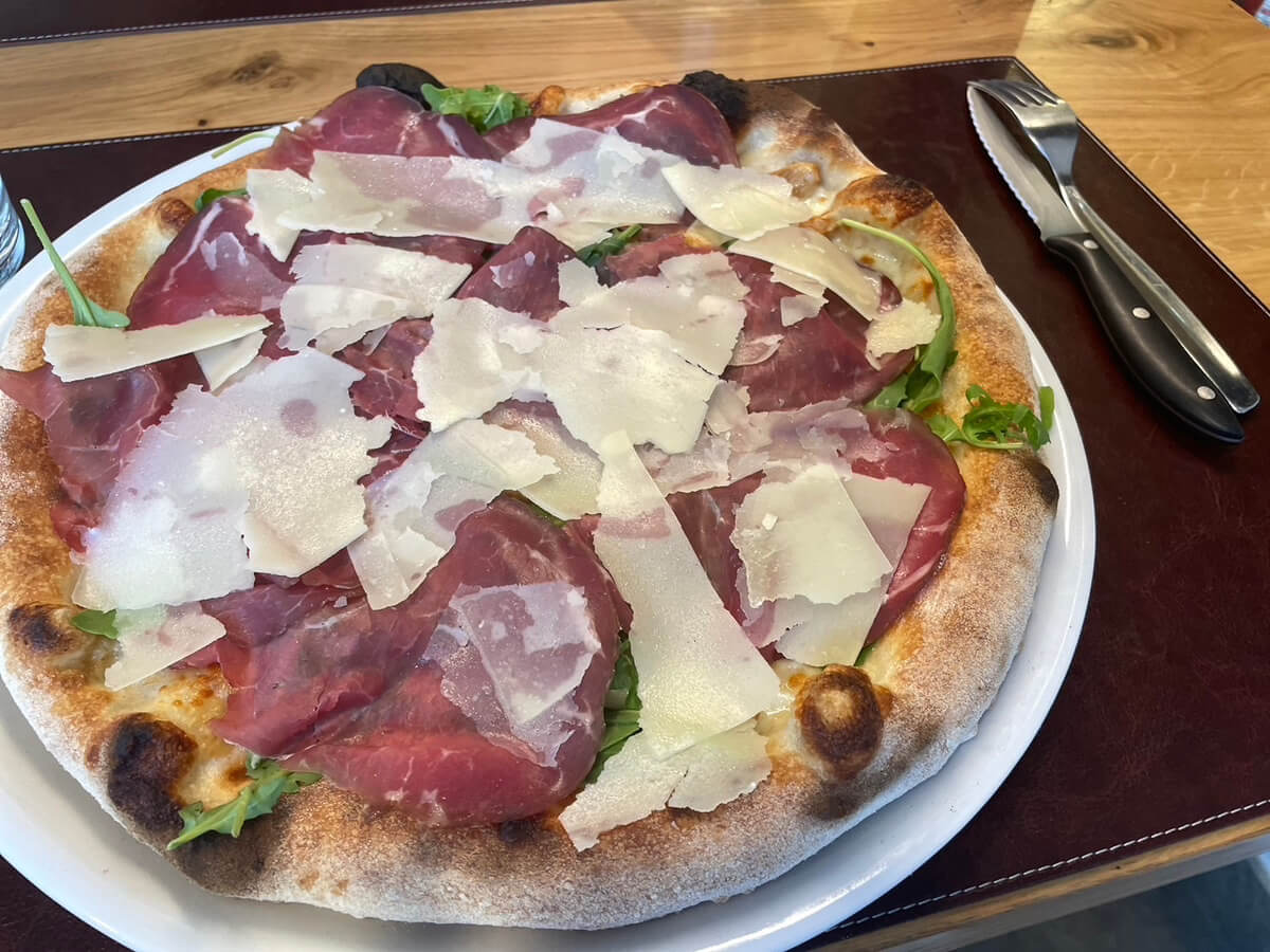 ↑ 2枚目:ルッコラ、トレンティーノの伝統的な料理の「Carne Salada」(塩漬け牛肉)のカルパッチョ、パルミジャーノチーズ。トッピングがどっさり乗っているのに、ルッコラのおかげでフレッシュな味のピッツァです。